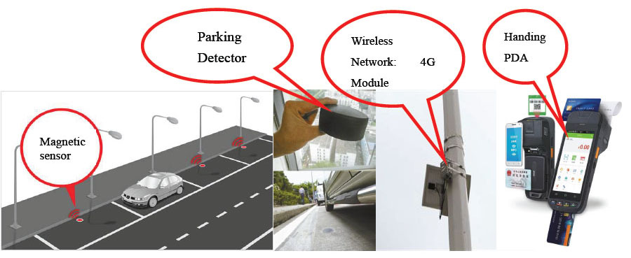 2G/3G/4G wireless public network communication is generally used between the front-end equipment and the management platform itself, and a 2.4G AD hoc network is used between the Parking Detectors and the roadside wireless communication devices. The parking state information that is acquired by the Parking Detectors is transmitted from the roadside and after it is summarised is uploaded to the management platform wirelessly. |