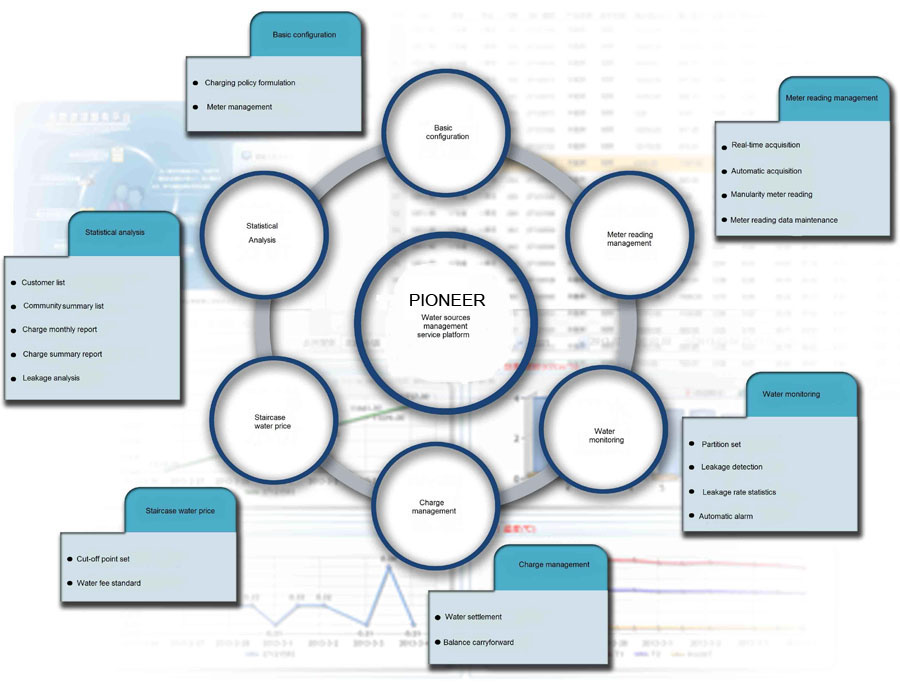 Pioneer Smart Water Service PlatformPioneer’s partition water metering management system solutions are established on the base of regional water supply and management. It involves installing metering controlling devices to the pipelines of water supply management areas. This implements value management of tap water resources in these areas. The devices grasp the regional water demands, balance the supply and marketing, dropout rates, non-chargeable water and so on, which reduces the production, marketing costs, and risk management within the operation of a city’s water supply. Features